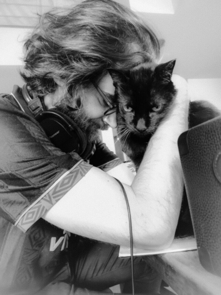 Aquí, no hay colores que distraigan de lo esencial: la profunda conexión entre dos seres. La cabeza se inclina, buscando refugio en la calidez oscura del pelaje. No es solo un gato; es un ancla en medio de un día ruidoso, un confidente silencioso cuya única respuesta es un ronroneo vibrante. En este abrazo, bajo la luz tenue, se encuentra una paz simple y absoluta, donde el único sonido importante es el latido compartido.