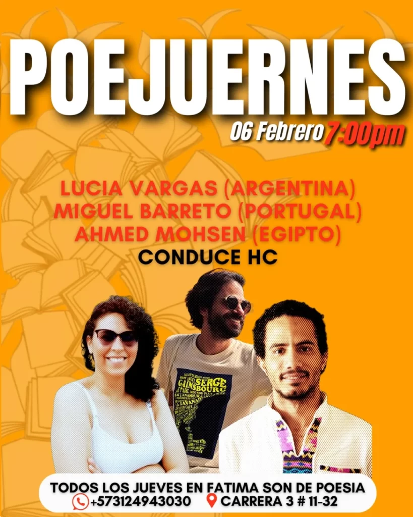 Um espaço para a poesia no antigo setor La Candelaria de Bogotá, um dos bairros emblemáticos desta cidade. Miguel Barreto, juntamente com Lucia Vargas, poetisa argentina radicada em Bogotá, e Ahmed Mohsen, do Egito, farão uma leitura da sua poesia no dia 6 de fevereiro, às 19h00.